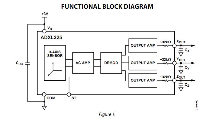 ADXL325BCPZ features: (1)3-axis sensing; (2)Small, low profile package, 4 mm × 4 mm × 1.45 mm LFCSP; (3)Low power: 350 μA typical; (4)Single-supply operation: 1.8 V to 3.6 V; (5)10,000 g shock survival; (6)Excellent temperature stability; (7)Bandwidth adjustment with a single capacitor per axis; (8)RoHS/WEEE lead-free compliant.